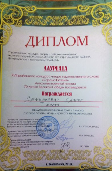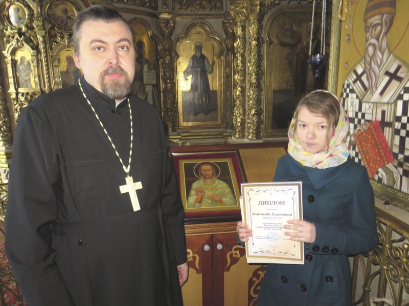 15 марта в районном конкурсе чтецов художественного слова «Страна Поэзия», посвященном юбилею 70-летия Великой Победы, принял участие представитель приходской молодежи Введенского храма с. Спирово, исполняющий послушание просфорника, член МПС «Ковчег» Демишкевич Даниил. Председателем жюри был преподаватель кафедры сценической речи Московского государственного университета культуры и искусств – Е. Ю. Пейч. По итогам конкурса в старшей группе Даниил занял первое место с произведением местного поэта Александра Ивушкина «О песне».