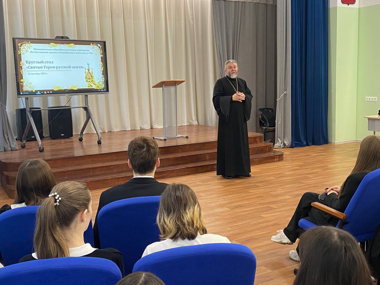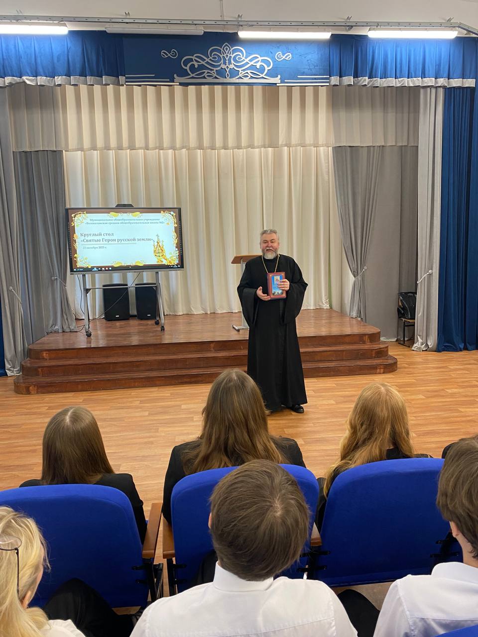 23 октября в окормляемом приходом Введенского храма с. Спирово учебном заведении МОУ СОШ 2 г.Волоколамска, прошла конференция в форме круглого стола на тему: «Святые герои русской земли». Приветственное слово произнес протоиерей Константин Попов, открывший данное мероприятие. С докладами о жизни и подвиге святых угодников, князей, воинов, их роли в истории Российского государства и Русской Церкви, выступили учащиеся школы. Очень содержательную информацию в докладах на тему встречи, учащимся школы было в свою очередь интересно услышать от гостей, студентов Московских Университетов МГИМО и МГОУ (ГУП) , приглашенных к участию в конференции. Модератор конференции была Карпухина В. В., преподаватель истории и обществознания, педагог школы.