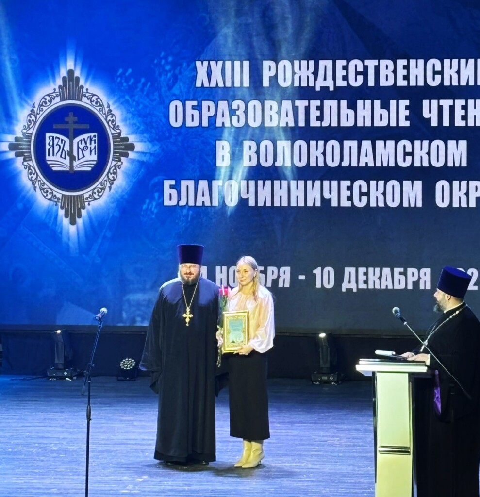 За усердные труды в деле духовно-нравственного воспитания подрастающего поколения и молодежи была награждена член общины прихода Введенского храма с.Спирово, учитель истории и обществознания окормляемого приходом учебного заведения МОУ «Волоколамская СОШ №2» Карпухина Виктория Викторовна, занявшая I место на муниципальном этапе Всероссийского конкурса «За нравственный подвиг учителя» в 2025 году.