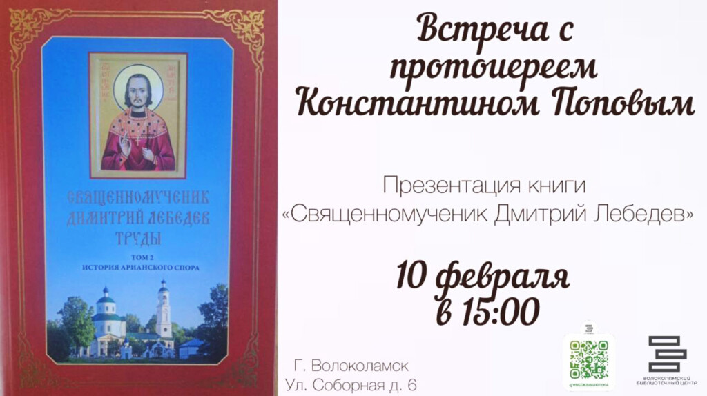 10 февраля в 15.00 в Волоколамской библиотеке (ул. Соборная дом 6) состоится встреча с настоятелем Введенского храма с. Спирово протоиереем Константином Поповым и презентация книги «Священномученик Димитрий Лебедев (Лебедев Д.А.). Труды. Том 2».